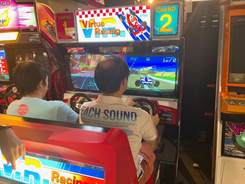 連休だからかお客さんも多く唯ならぬ熱気の中、ちょっと目を離していた隙にロタ部長とTeru兄がバーチャレーシングで対決!