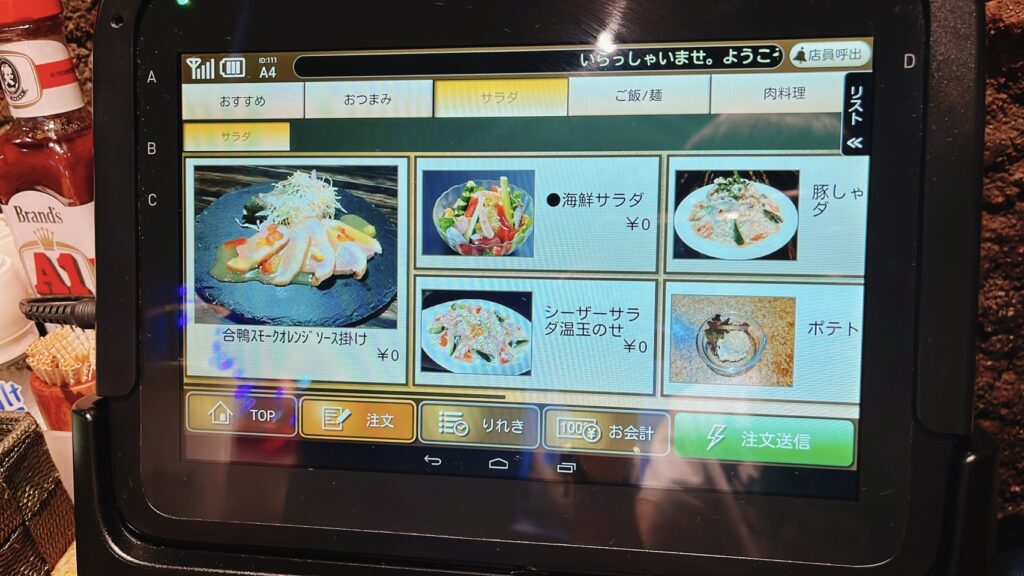 なお、この日にタッチパネルにあったメニューは以下のとおりでした
