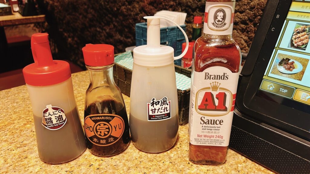 ・席に塩、胡椒、A1ソースなどの調味料が置いてある