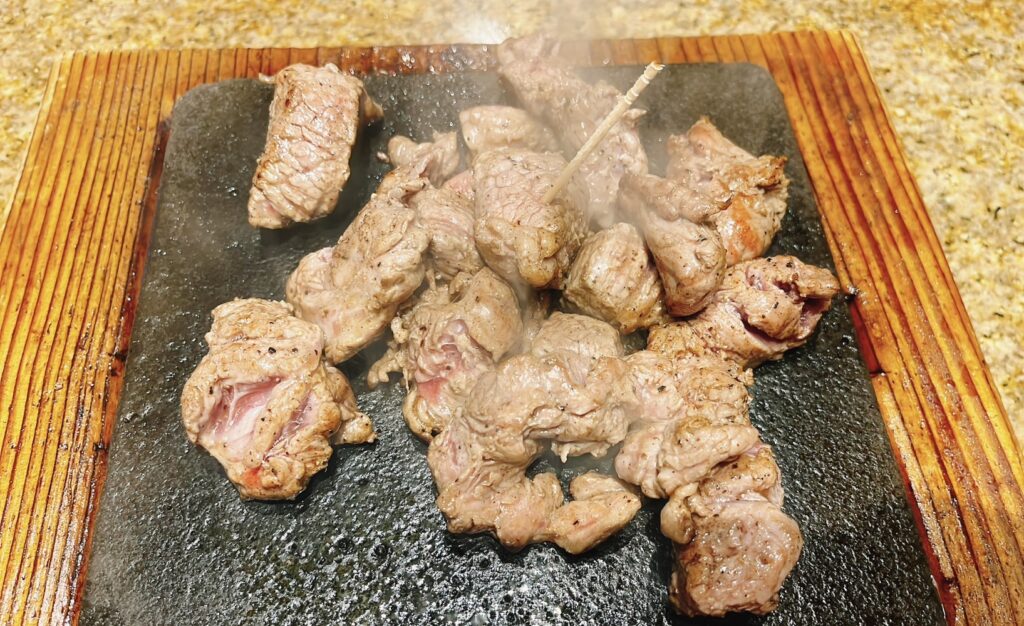 やっぱりステーキと同じくアツアツの溶岩石プレートにのって紙がかぶされてジュージュー言いながら来ました!