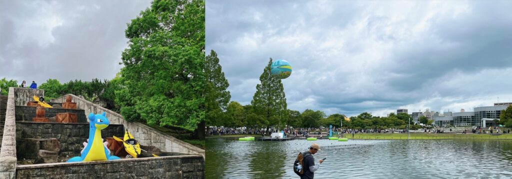 七北田公園はGOフェスをやる(累計で数万人のトレーナーが来る)公園としてはちょっと狭くて(日比谷公園よりちょっと広いくらい?)、わりと混み気味でしたが公園内でも係員が丁寧な誘導や声掛け(立ち止まるときは端へ寄ってください)をしていて良いコントロールをしていました。