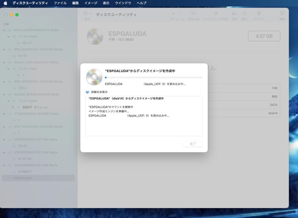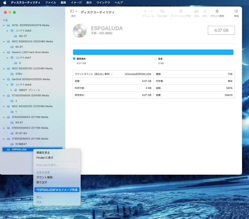左のマウントされたディスクを右クリックして「イメージ作成」
