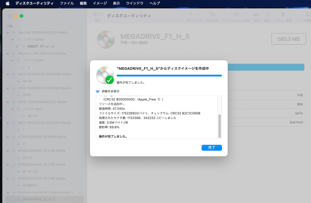 Macの「ディスクユーティ」でプレステ2のソフトはアッサリ手早く吸い出す事は可能でした!しかしメガCDはISOディスクイメージ作成は可能、サターンのソフトは吸い出し出来ませんでした。どのみちCDの音声(CD-DA)を使っているソフトは「.bin」「.cue」などの複数のファイルにしないと音が出ませんので、この方法では無理ですね。