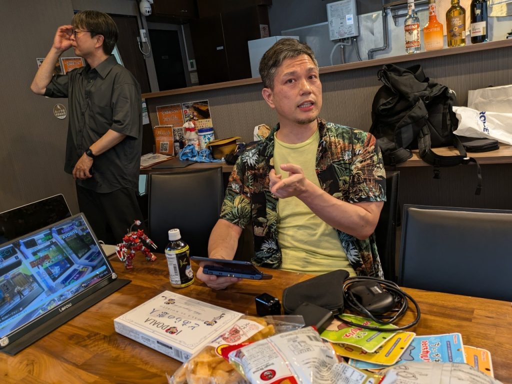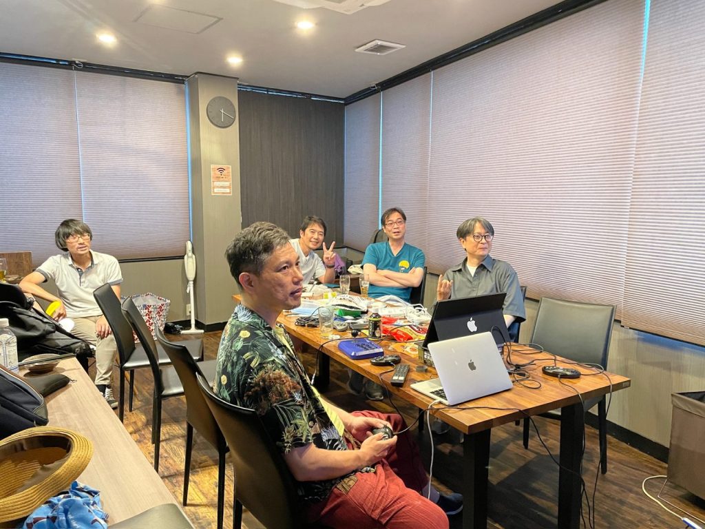 取り敢えずTVのセッティング、とめぞうさんはMacとモバイルモニターのセッティング。ザッキーは煮込みを温め、ヨッシーはBGM用のカセットプレイヤーとアンプ付スピーカーの用意!