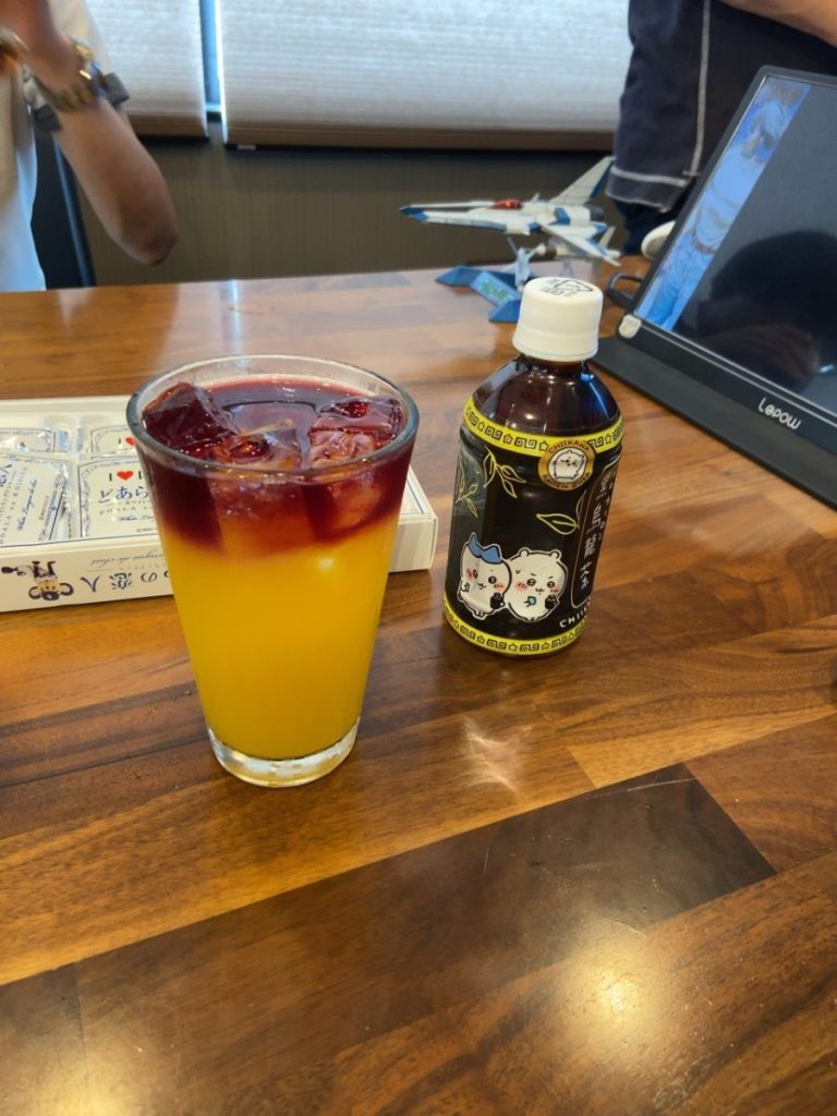 とめぞうさんに「ファジーネーブル(ピーチ&オレンジジュース)」を作ったのですが、色気を出してワインをフロートしてしまった・・・・(とめぞうさんはお酒の味が苦手)今思うと失敗!見た目、皆のウケは良かったけどね(笑)