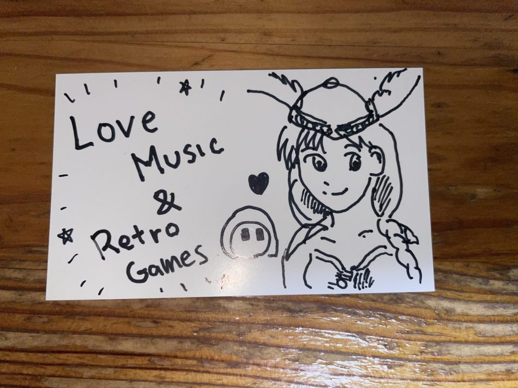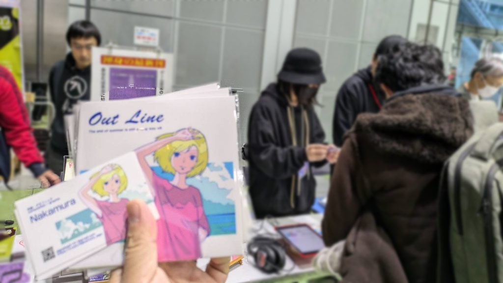 早速向かうのは「Out Line」の物販コーナー!ナカムラさんに挨拶し、CDとシールを購入!名刺が配られていたのでここは折角と、ANIも名刺をお渡ししました。と言うのは半分嘘で予め裏面にイラストを書いてお渡ししようと仕込んでおいたものだったのでした。