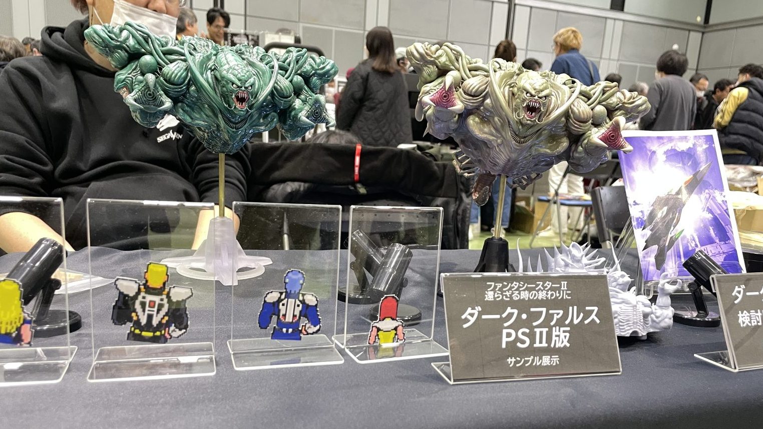 とめぞうさんから頼まれたキットを購入すると斗々屋さん直筆のイラスト色紙(その場で描いてもらう)が貰えるという素敵なキャンペーンもやっていました。事前に何を描いてもらうかとめぞうさんには聞いていなかったのでANIが「ファンタシースター2のデータメモリー嬢は鉄板だし彼も好きなはず!」という事で勝手ながらオーダー。しかしとめぞうさんに連絡取って確認してみると一致したので一安心!