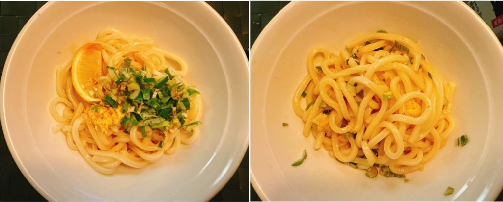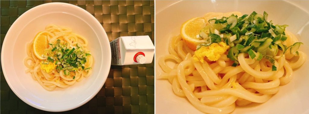 今回は1袋(2食分)を使って釜バターと醤油うどん(冷)を作りました。