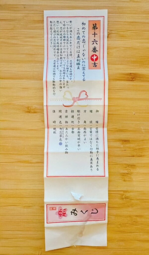 ・ひっくり返すと「恋みくじ」2枚と「おまけコラム」1枚が貼り付けられている