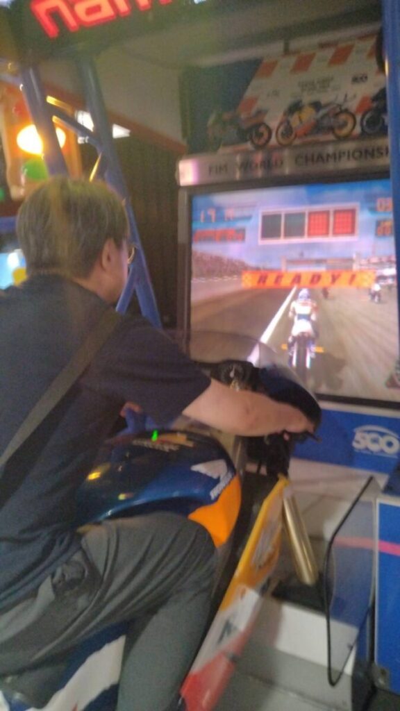 ヨッシーはNAMCOのシミュレーターの様なバイクゲーム(タイトル忘れました:汗)に挑戦!これもなかなか難しそうですが様になってます!